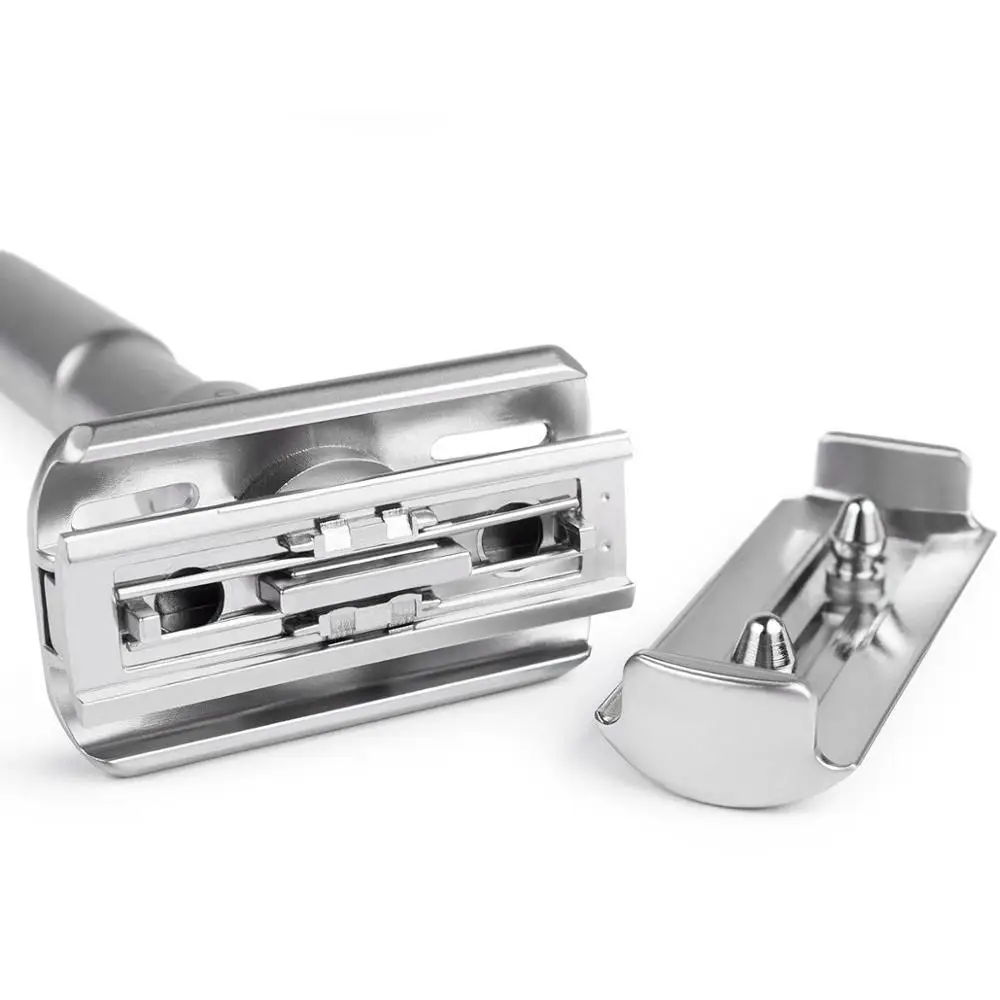 Unlike other razors that use a screw to hold the blade in place, this razor uses a clip. This design makes it easy to change the blade.